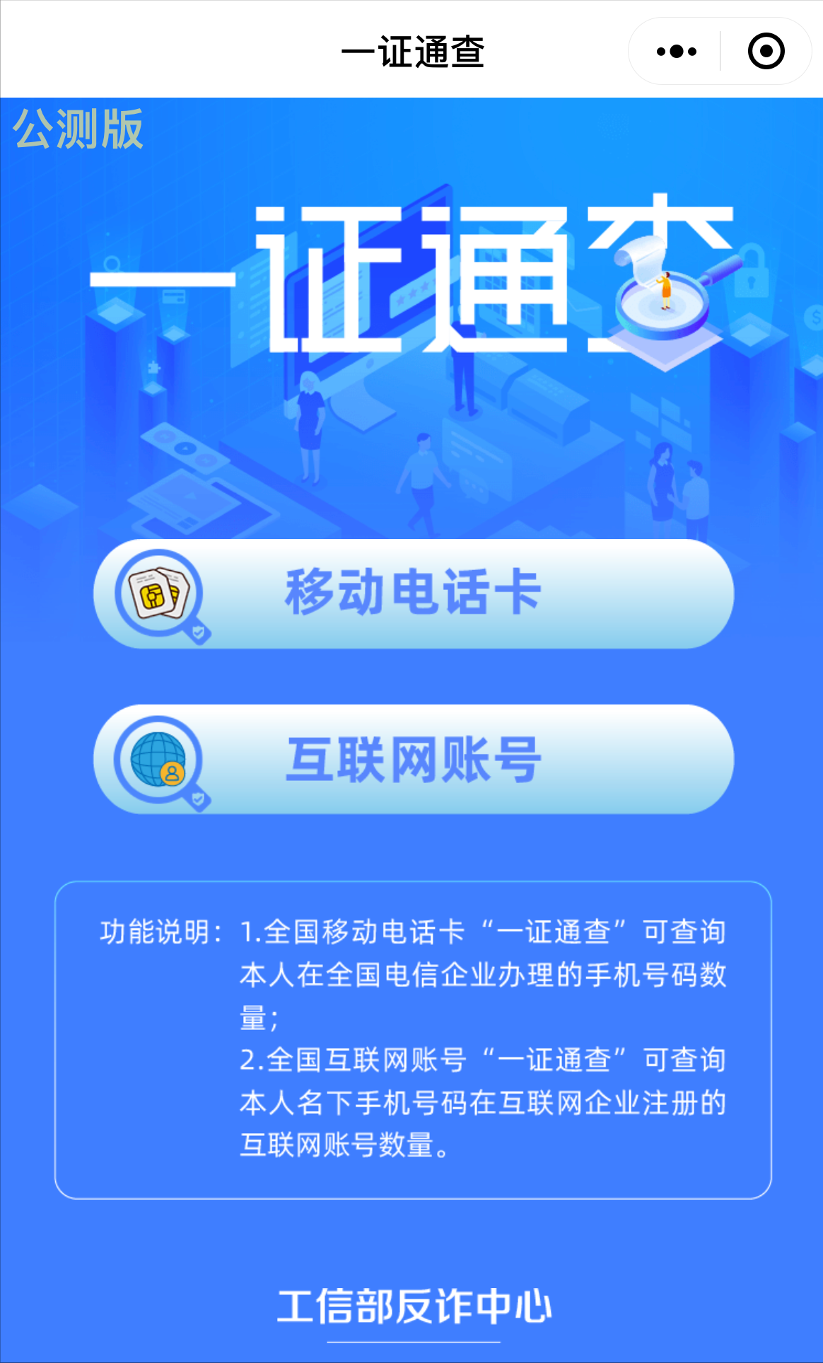 - 微信公众号“工信部反诈专班”-->便民服务-->一证通查;