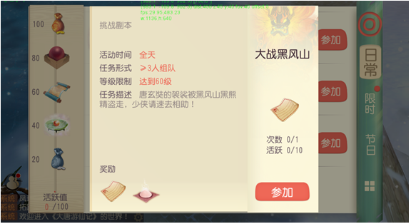 60级以上玩家,不少于3人组队,点击活动面板参加