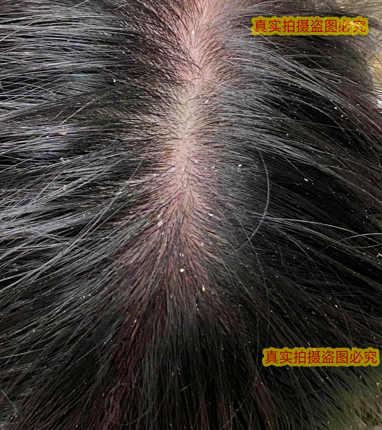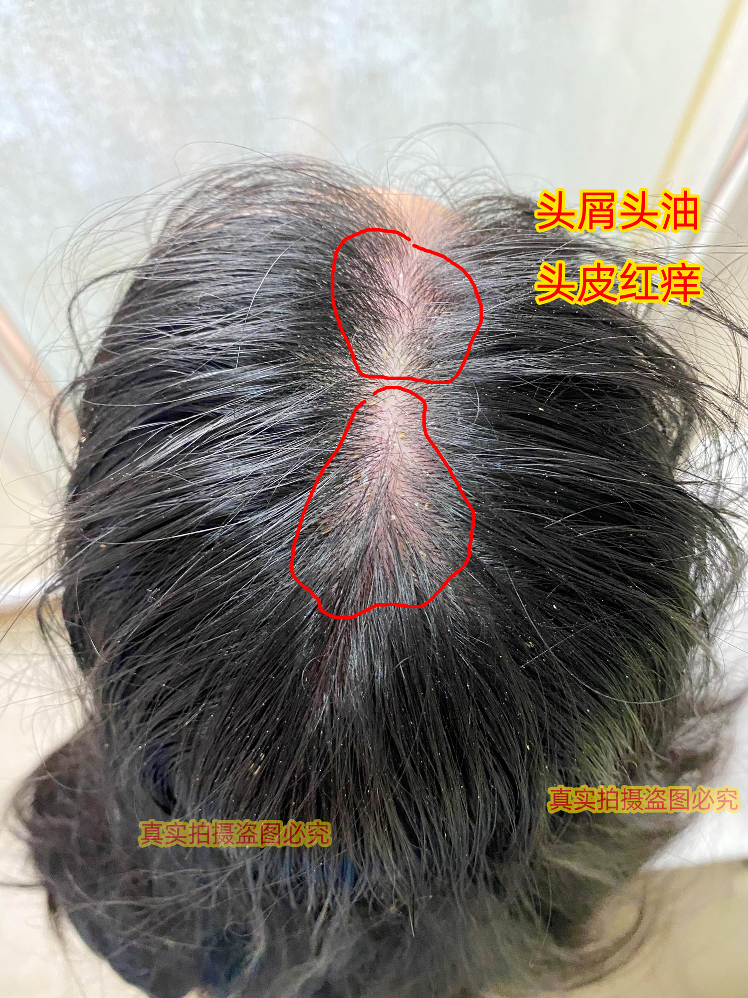 未洗头前头发油臭,头屑多,头皮痒挠的发红,特意拍摄记录,用作对比。