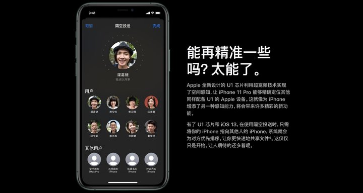 就以拖拽传输文件为例,有了 U1 芯片 AirDrop 的传输速度获得了不小的提升,甚至未来连接设备也能超出 3 台的限制。