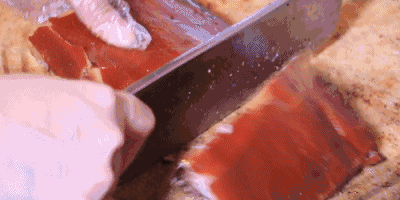 光看这切面都觉得无敌了,一层金黄的皮,一层恰到好处的油脂,细腻紧实的肉质!
