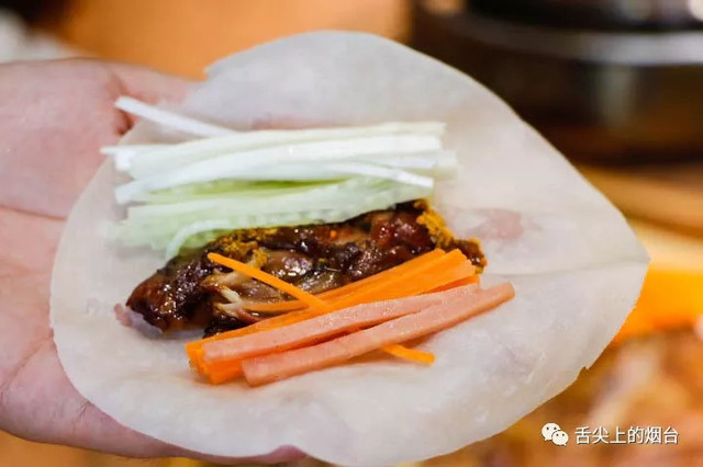 羊肉可以切片蘸料吃,也可以像烤鸭一样卷饼吃。